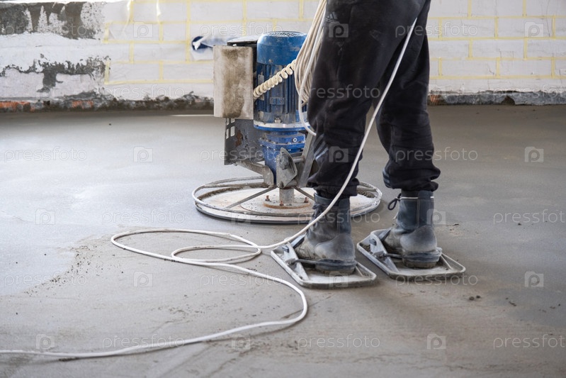 Утрамбовка и шлифовка полусухой стяжки пола машиной с вращающимся диском для выравнивания. Устройство бетонного пола в доме, мастер со спецтехникой
