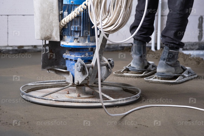 Утрамбовка и шлифовка полусухой стяжки пола машиной с вращающимся диском для выравнивания. Устройство бетонного пола в доме, мастер со спецтехникой