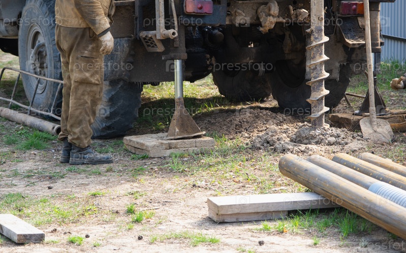 Бригада рабочих с буровой установкой на машине бурит артезианскую скважину для воды в земле. Закладка металлической обсадной трубы в землю, установка индивидуального питьевого водоснабжения, 28 июня 2022, Россия,