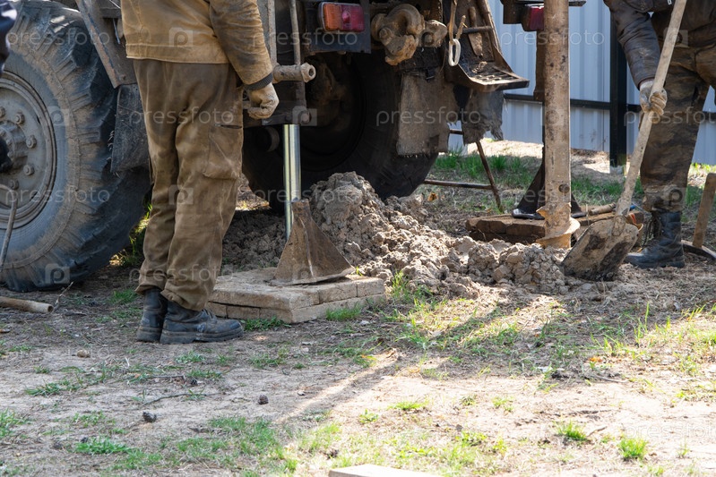 Бригада рабочих с буровой установкой на машине бурит артезианскую скважину для воды в земле. Закладка металлической обсадной трубы в землю, установка индивидуального питьевого водоснабжения, 28 июня 2022, Россия,