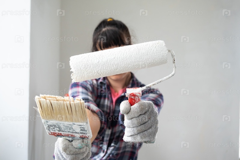 Озадаченная женщина в малярном валике и белой краске для стен в руках портрет крупным планом. Строительные работы и косметический ремонт в доме, покраска стен, тонировка, отделочные работы своими руками