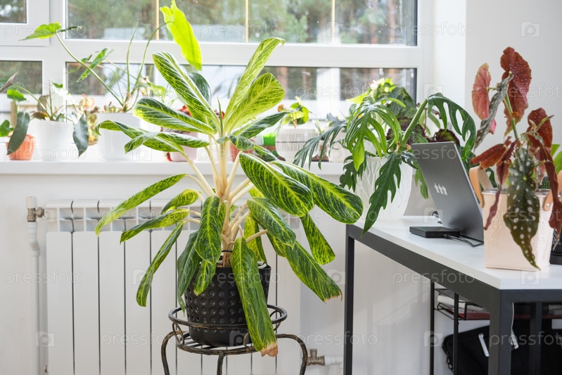 Крупный план аглаонемы в интерьере на столе. Комнатное растение Выращивание и уход за комнатным растением, зеленый дом