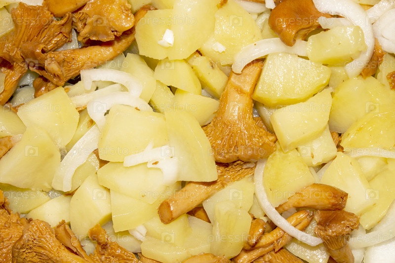 Жареное картофель с лисицами-грибами.Фон из жареного картофеля с лисицами.Сжатые картофели с грибами Chanterelle.Фон жаренных картофелей с chanterelles