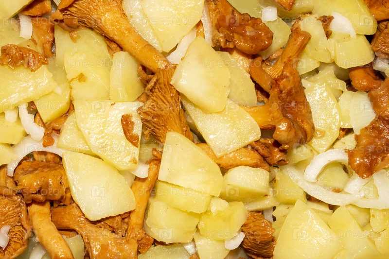 Жареное картофель с лисицами-грибами.Фон из жареного картофеля с лисицами.Сжатые картофели с грибами Chanterelle.Фон жаренных картофелей с chanterelles
