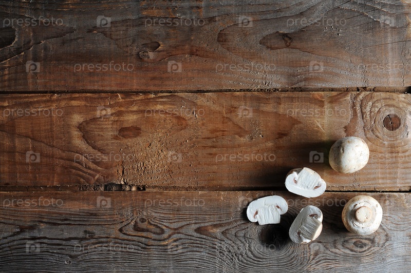 Свежие белые грибы шампиньоны на деревенском деревянном фоне