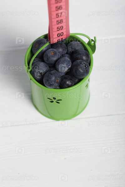 Крупная черника в декоративном ведре. Сантиметровая лента для измерения талии. Международный день без диет. На белом фоне. Крупный план