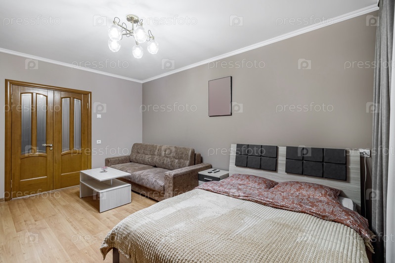 Большая двуспальная кровать в комнате с диваном прикроватная тумбочка