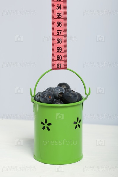 Крупная черника в декоративном ведре. Сантиметровая лента для измерения талии. Международный день без диет. На белом фоне. Крупный план