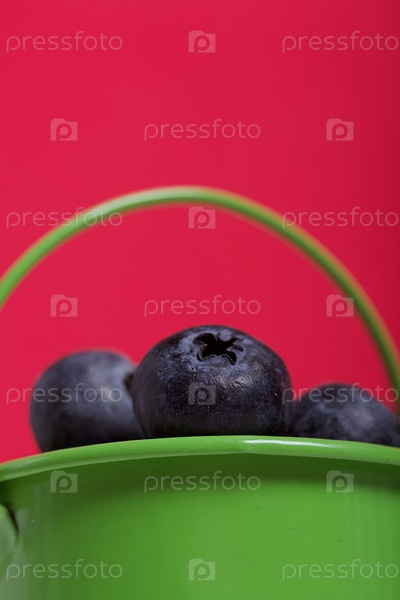 Светло-зеленое декоративное ведерко с крупной черникой. Международный день без диет. На коралловом фоне. Крупный план