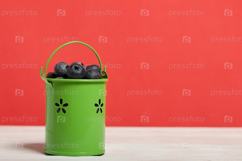 Светло-зеленое декоративное ведерко с крупной черникой. Международный день без диет. На коралловом фоне. Крупный план