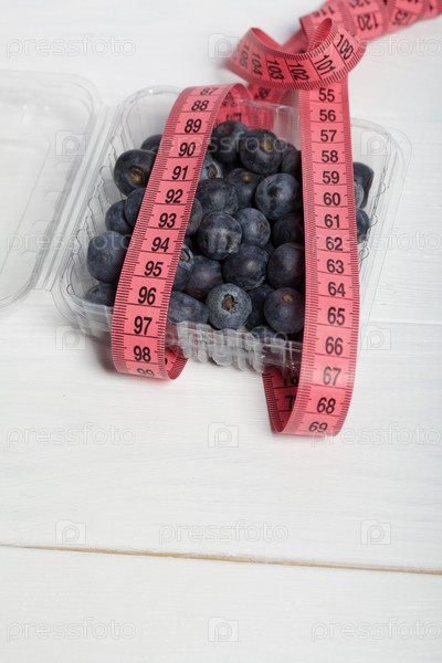 Крупная черника в декоративном ведре. Сантиметровая лента для измерения талии. Международный день без диет. Крупный план