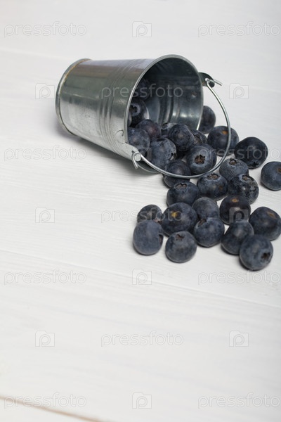 Перевернутое декоративное ведро. Рассеянная крупная черника. Международный день без диет. На белом фоне. Крупный план