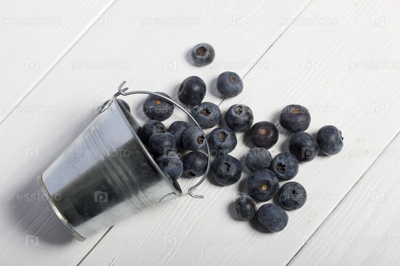 Перевернутое декоративное ведро. Рассеянная крупная черника. Международный день без диет. На белом фоне. Крупный план