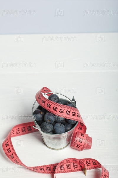 Крупная черника в декоративном ведре. Сантиметровая лента для измерения талии. Международный день без диет. На белом фоне. Крупный план