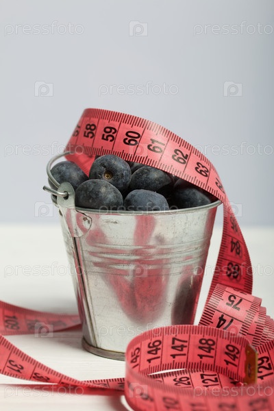 Крупная черника в декоративном ведре. Сантиметровая лента для измерения талии. Международный день без диет. На белом фоне. Крупный план