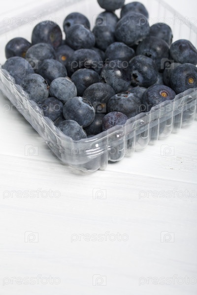 Крупная черника в декоративном контейнере. Международный день без диет. На белом фоне. Крупный план