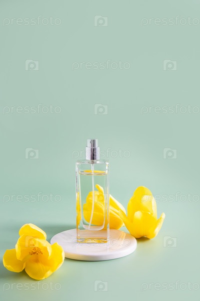 Прозрачная бутылка косметики или спрея стоит на белом круглом подиуме с желтыми тюльпанами. вертикальный вид. пространство для копирования. зеленый фон
