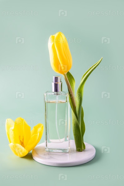 Прозрачная бутылка женских духов или туалетной воды стоит на белом круглом мраморном подиуме с весенним цветком. презентация продукта. макет