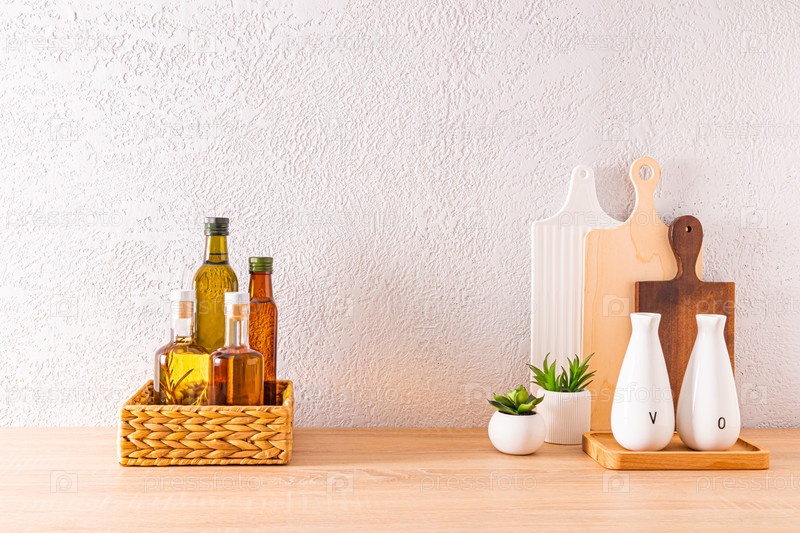 Красивый кухонный фон с различными бутылками масла для приготовления пищи на деревянной столешнице. передний план. место для текста