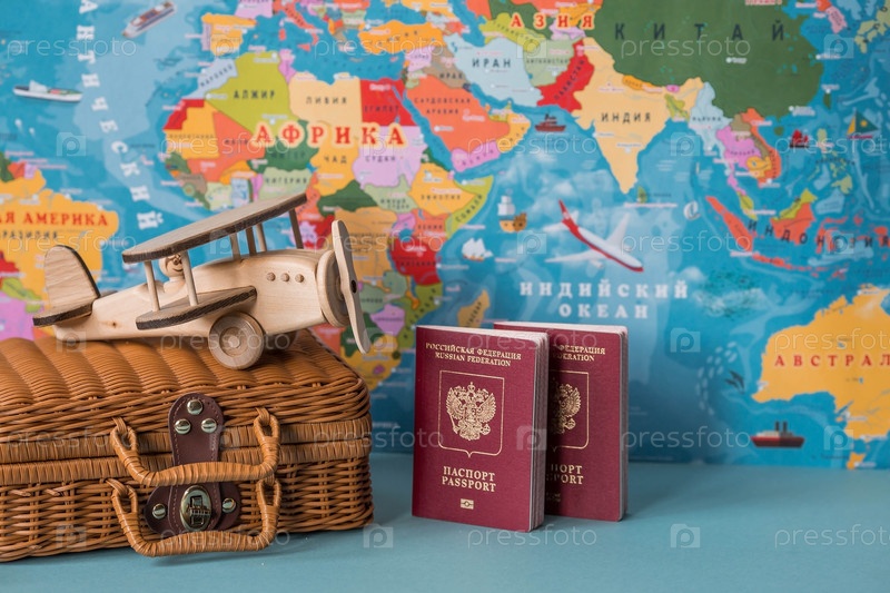 Туризм. Модель винтажного самолета, чемодан и российский паспорт на фоне карты мира. Концепция путешествия, приключений и открытий