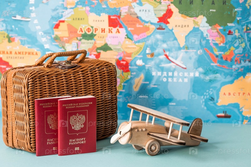 Туризм. Модель винтажного самолета, чемодан и российский паспорт на фоне карты мира. Концепция путешествия, приключений и открытий