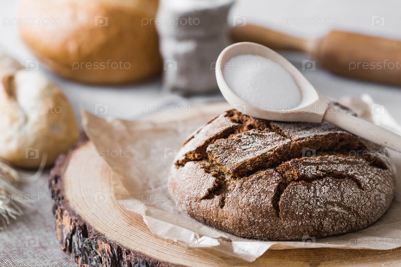Свежий вкусный хлеб крупным планом и соль. Свежеиспеченный хлеб на закваске с золотой корочкой на деревянной доске. Контекст пекарни с вкусным хлебом. Кондитерские изделия