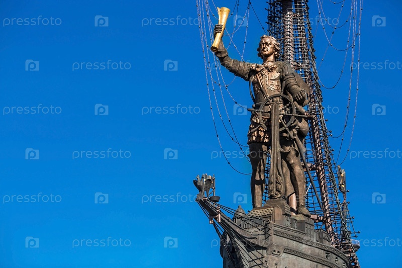 МОСКВА, РОССИЯ - МАРТ 2023: Статуя Петра Великого в парке Музеон, 98-метровый памятник Петру 1 в Москве на фоне красивого голубого неба. Заходящее солнце. Мягкий свет. Яркое солнце