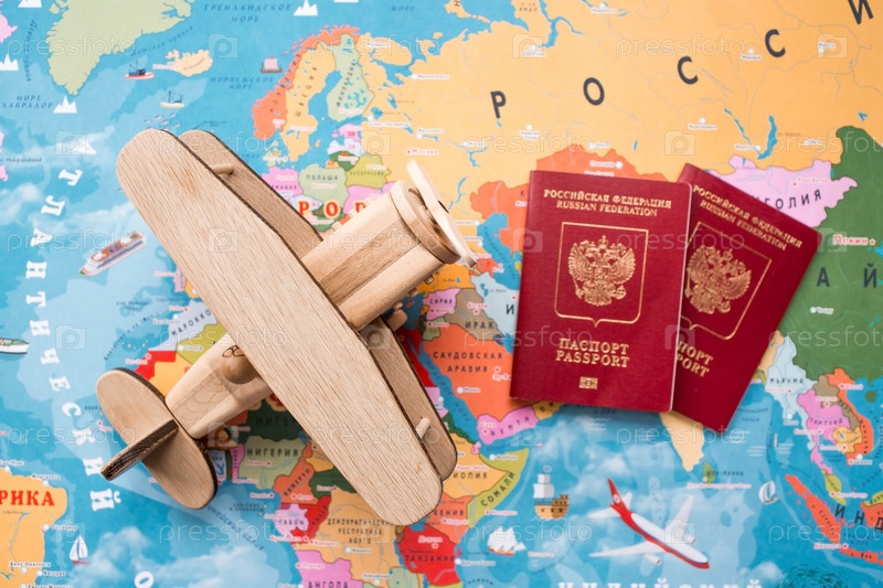 Туризм. Модель винтажного самолета и российский паспорт на фоне карты мира. Концепция путешествия, приключений и открытий
