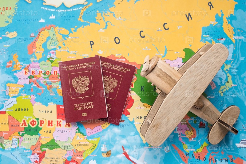 Туризм. Модель винтажного самолета и российский паспорт на фоне карты мира. Концепция путешествия, приключений и открытий
