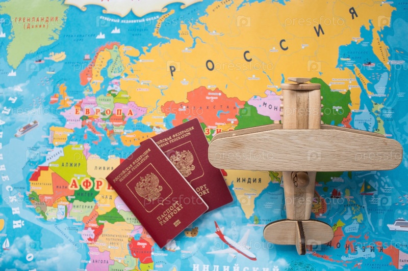 Туризм. Модель винтажного самолета и российский паспорт на фоне карты мира. Концепция путешествия, приключений и открытий