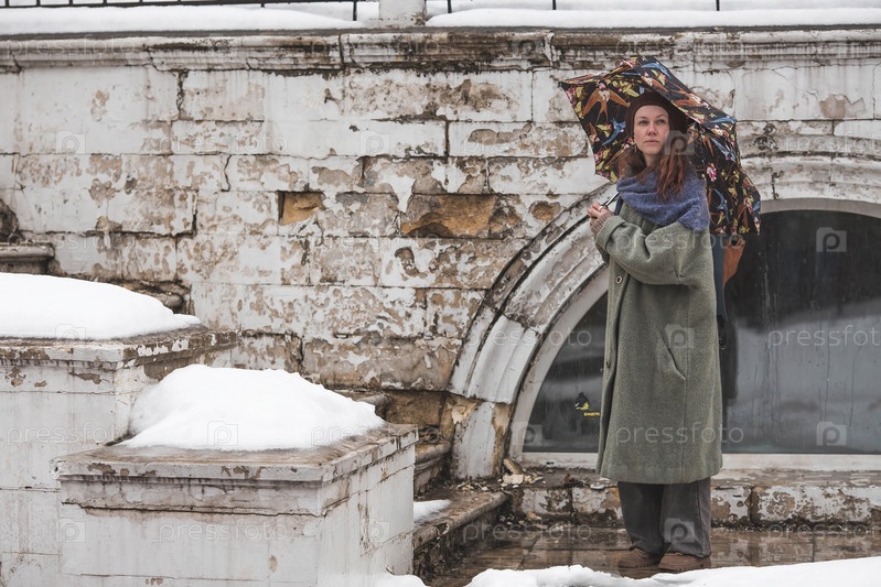 Портрет милой молодой женщины в берете с зонтиком ранней весной на открытом воздухе. Девушка с распущенными волосами и в длинном пальто на фоне старинной усадьбы