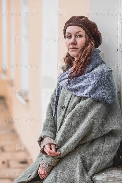 Портрет милой молодой женщины в берете ранней весной на открытом воздухе. Девушка с распущенными волосами и в длинном пальто на фоне старинной усадьбы