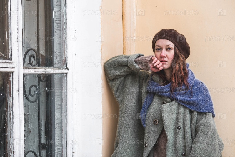 Портрет милой молодой женщины в берете с зонтиком ранней весной на открытом воздухе. Девушка с распущенными волосами и в длинном пальто на фоне старинной усадьбы