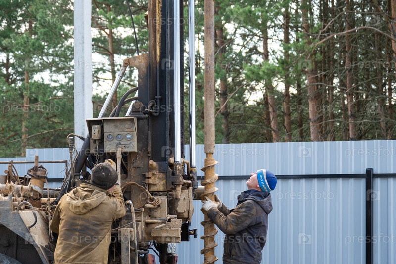 Бригада рабочих с буровой установкой на машине бурит артезианскую скважину для воды в земле. Закладка металлической обсадной трубы в землю, установка индивидуального питьевого водоснабжения, 28 июня 2022, Россия,