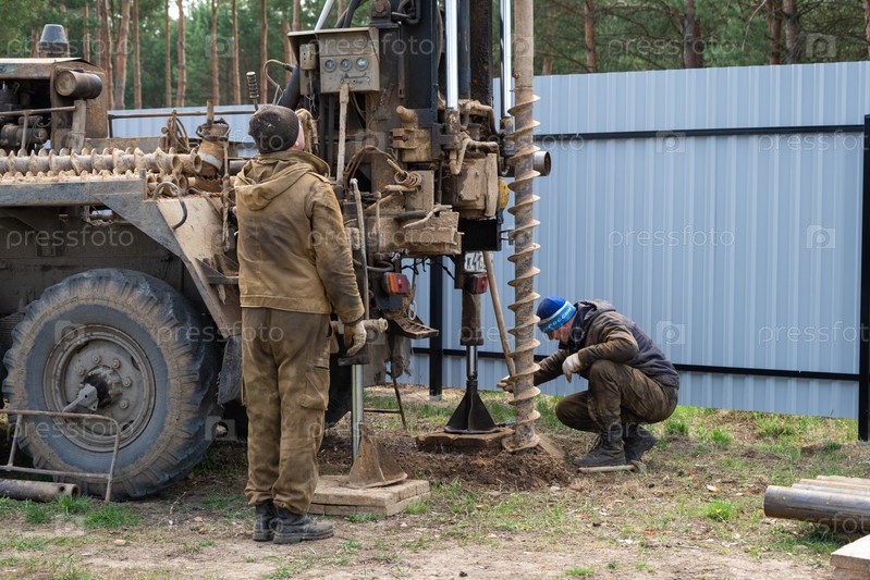 Бригада рабочих с буровой установкой на машине бурит артезианскую скважину для воды в земле. Закладка металлической обсадной трубы в землю, установка индивидуального питьевого водоснабжения, 28 июня 2022, Россия,