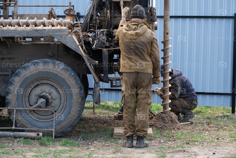 Бригада рабочих с буровой установкой на машине бурит артезианскую скважину для воды в земле. Закладка металлической обсадной трубы в землю, установка индивидуального питьевого водоснабжения, 28 июня 2022, Россия,