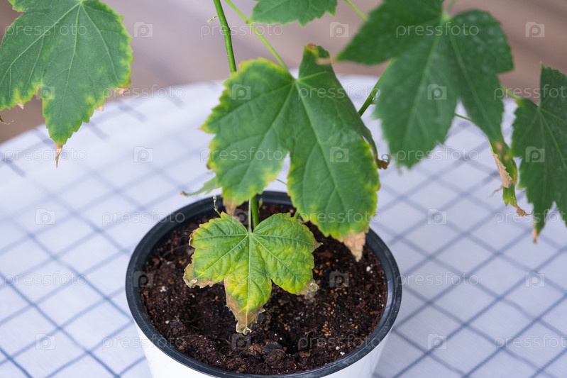 Проблемы выращивания домашних растений – сухие желтые кончики листьев, сухой воздух, недостаток влажности. Крупный план листа