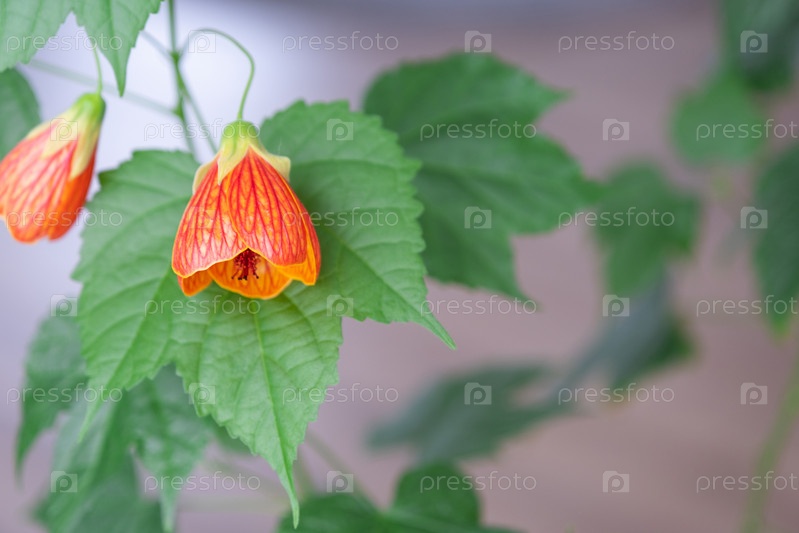 Цветущий оранжевый колокольчик Абутилон крупным планом, веревочная ягода из семейства Мальвовых. Уход и выращивание домашних растений на подоконнике