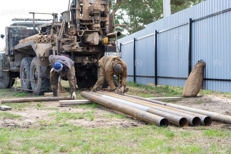 Бригада рабочих с буровой установкой на машине бурит артезианскую скважину для воды в земле. Закладка металлической обсадной трубы в землю, установка индивидуального питьевого водоснабжения, 28 июня 2022, Россия,