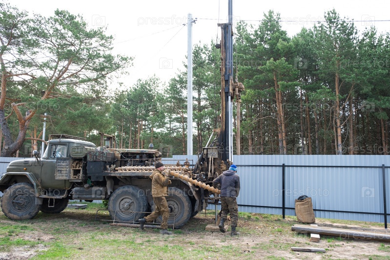 Бригада рабочих с буровой установкой на машине бурит артезианскую скважину для воды в земле. Закладка металлической обсадной трубы в землю, установка индивидуального питьевого водоснабжения, 28 июня 2022, Россия,