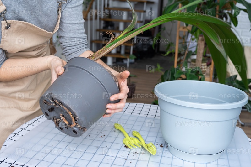 Женщина пересаживает орех кокосовой пальмы с комком земли и корнями в горшок дома в интерьере. Теплица, уход и выращивание тропических растений