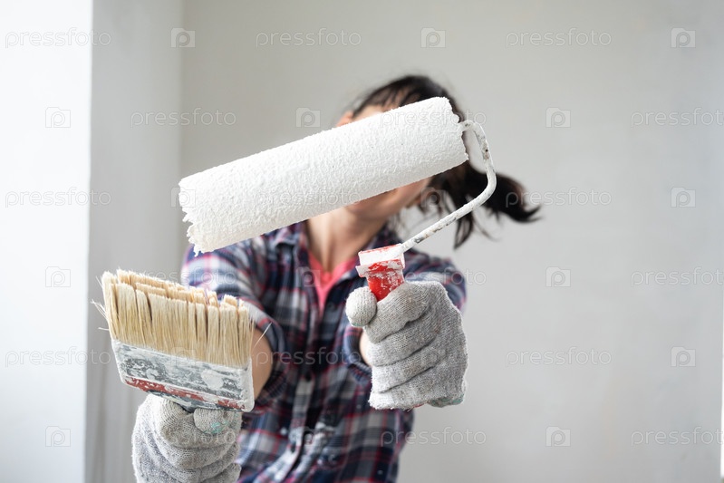 Озадаченная женщина в малярном валике и белой краске для стен в руках портрет крупным планом. Строительные работы и косметический ремонт в доме, покраска стен, тонировка, отделочные работы своими руками