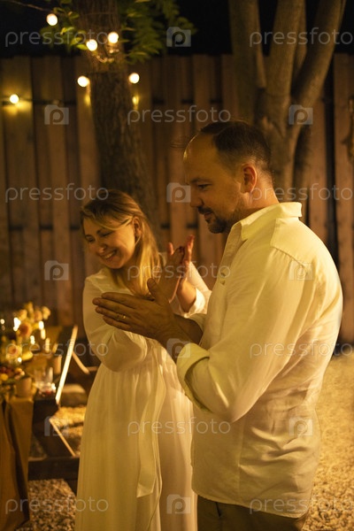 Свадебная пара средних лет наслаждается романтическими моментами на свежем воздухе в летнем саду