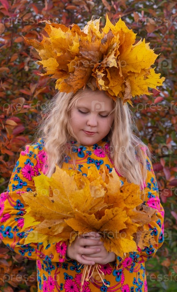 Осень. Девочка держит в руках опавшие осенние желтые красивые листья клена
