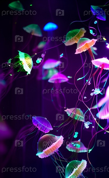 Яркий абстрактный фэнтезийный неоновый фон с медузами