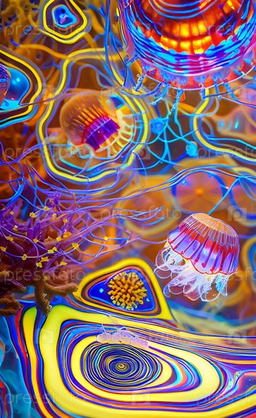 Яркий абстрактный фэнтезийный неоновый фон с медузами