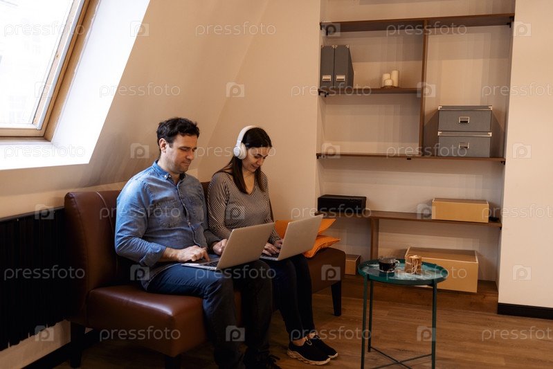 Улыбающаяся взрослая пара в наушниках, цифровой видеозвонок на ноутбуке, счастливые брюнетки мужчина и женщина