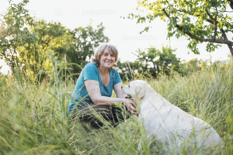 Пожилая седая женщина со своей собакой в парке