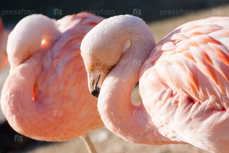 Два розовых нежных фламинго в солнечном свете, избирательный фокус, Беппу, Япония