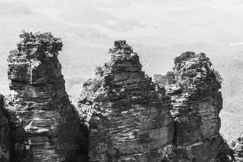 Черно-белое изображение скалы Три сестры крупным планом. Голубые горы. Эхо-Пойнт Катумба, Новый Южный Уэльс, Австралия